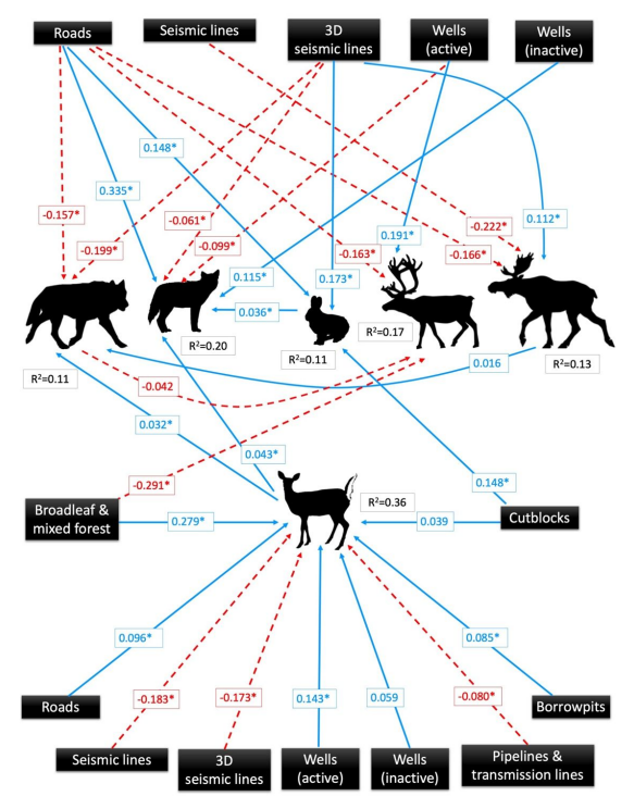 The Oil Sands Monitoring program is a joint venture designed by academic, provincial, Indigenous, and industry partners to assess many aspects of ecosystem impacts of industrial oil and gas activities in Alberta, but here my collaborators and I work with the large mammal component of the Terrestrial Biological Monitoring team. We are continuously learning more about the impacts of oil and gas on large mammal communities, generating long-term insights on how these activities affect iconic Canadian mammals.